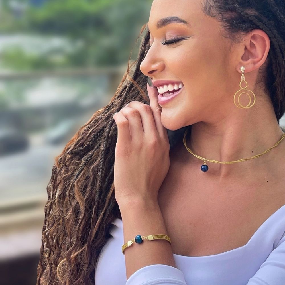 Uma Biojoia que une elegância natural e sustentabilidade. Feito a partir de Capim Dourado, material da região do Jalapão (TO) e Pedra Natural Ágata Azul. O Colar apresenta uma técnica apurada dos artesãos no manuseio do Capim Dourado em conjunto com Pedras Naturais para criar peças sofisticadas.
